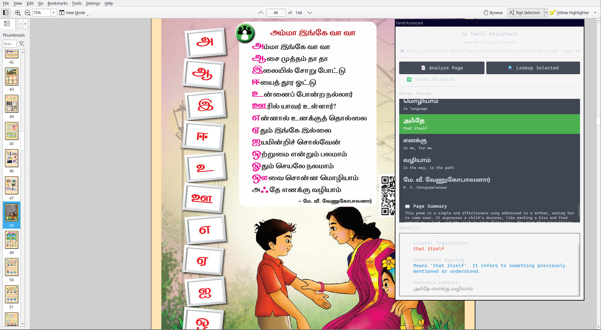 Press Mod+Y (or launch from the application menu), and the Tamil Assistant appears as a floating panel on the right side of the screen. The PDF stays in full view. Skanda can: