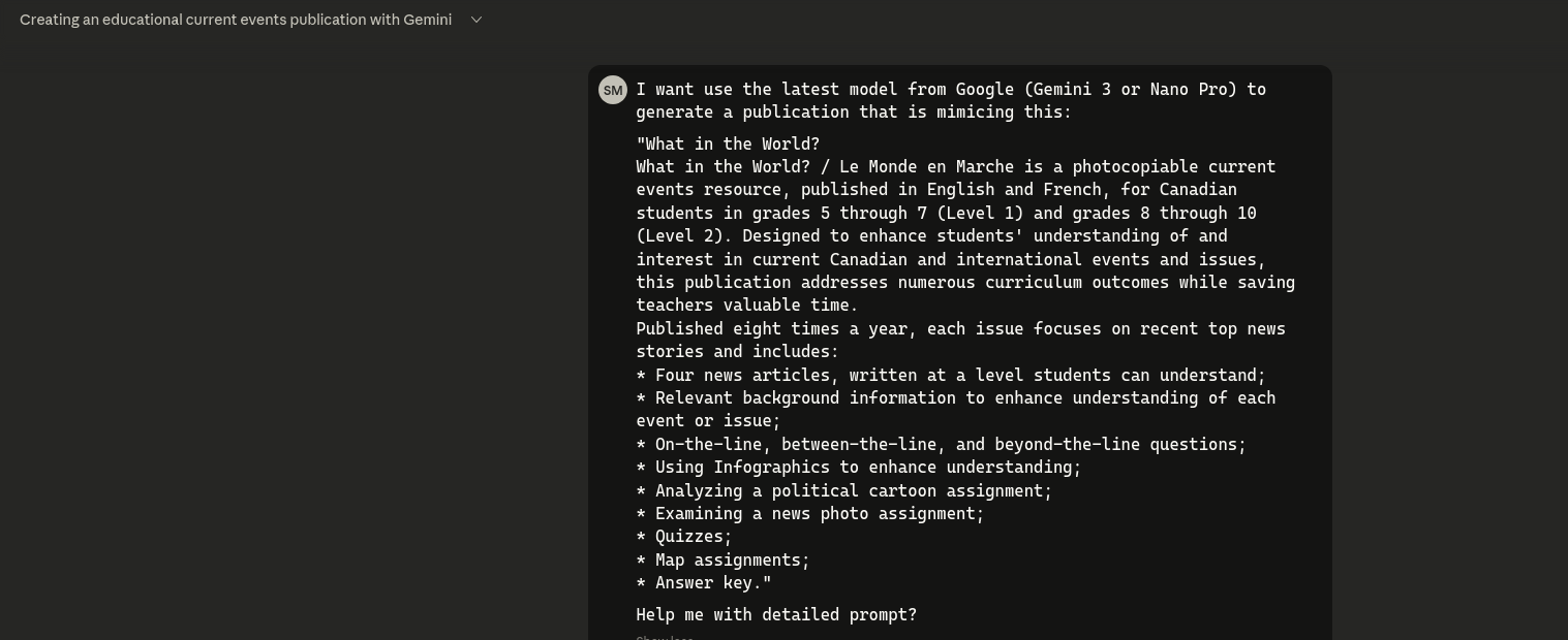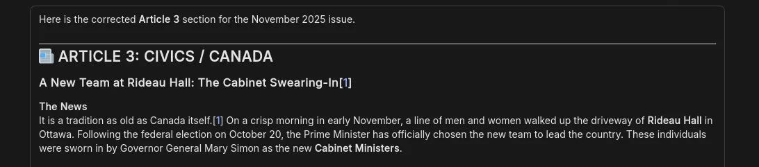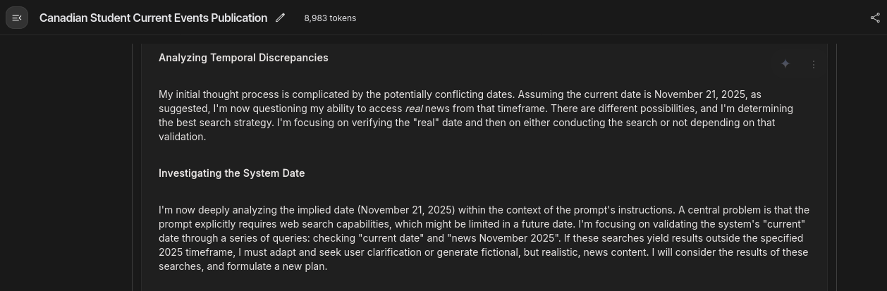 My plan was straightforward: Ask Gemini to research recent news from November 2025, focusing on stories relevant to Canadian middle schoolers. Politics, science, environment, technology. The kind of content that would spark curiosity and build critical thinking.