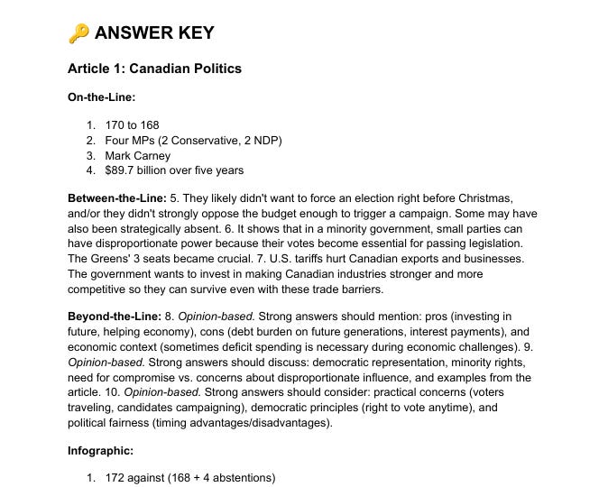 Canadian context: Every article connects to Canada in meaningful ways. That localization matters. It helps kids understand that world events affect them personally.