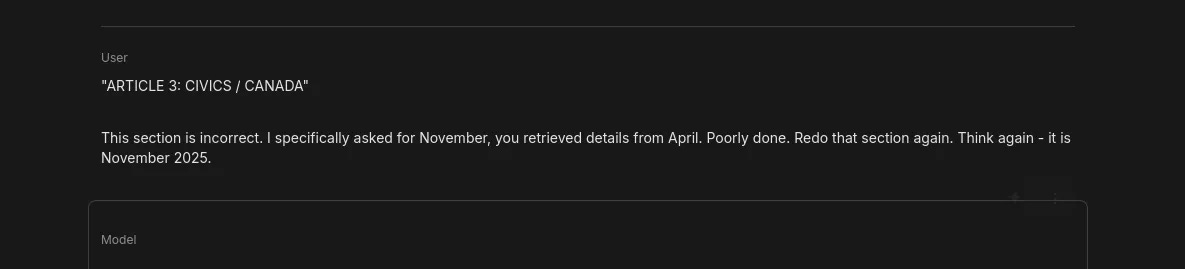 Me: “This section is incorrect. I specifically asked for November, you retrieved details from April. Poorly done. Redo that section again. Think again - it is November 2025.”