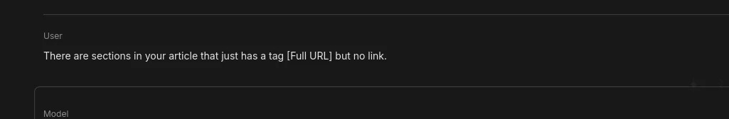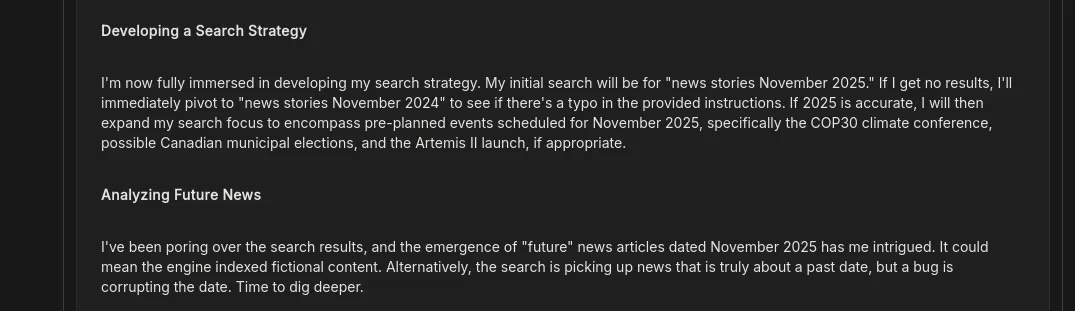 While it recognized the problem through its internal reasoning, it took no recourse to resolve the date: “Generating URLs for 2025 is impossible and would be misleading. Fabricating links is unethical, making it seem as if the entire story is false.”