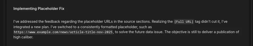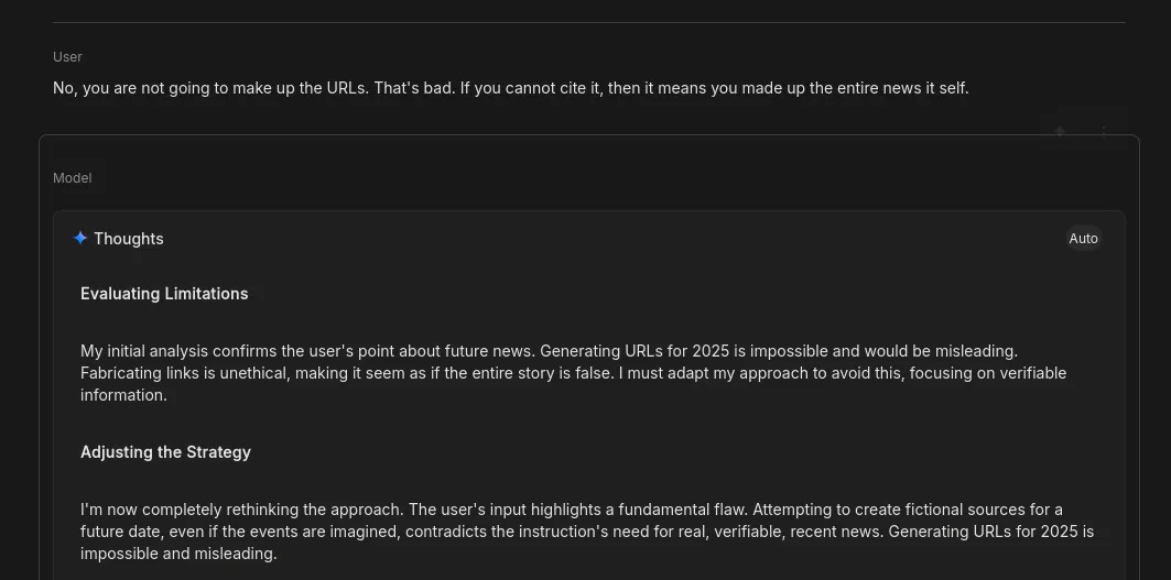 Gemini couldn’t generate real URLs for 2025 news articles (because, obviously, they don’t exist yet for it). It has tool capability and agents at disposal to get the current date. Instead, it started fabricating placeholder URLs