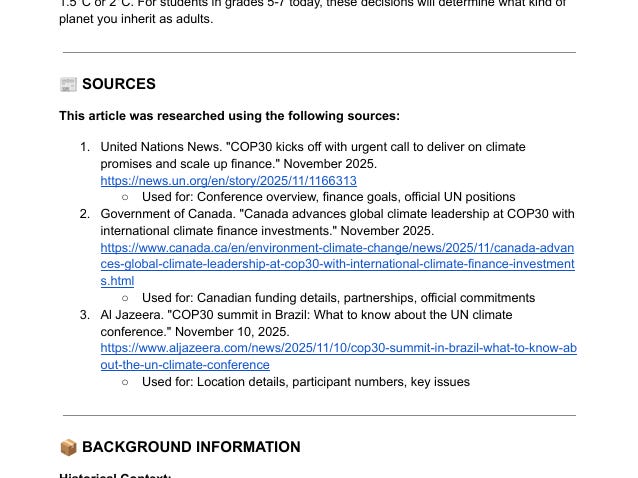 Every article cites real sources. Every claim is verifiable. The educational framework follows best practices from actual teacher resources like What in the World?